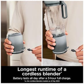 A tampa para gole integrada e a alça de silicone permitem que você beba diretamente do recipiente e leve o facilmente para qualquer lugar. O indicador de vida útil da bateria fornece uma leitura em tempo real sobre quando uma carga é necessária, sem mais adivinhações sobre quando você precisa carregar. A base recarregável oferece o maior tempo de execução de mistura de qualquer liquidificador sem fio, e uma carga completa leva aproximadamente 3 horas.