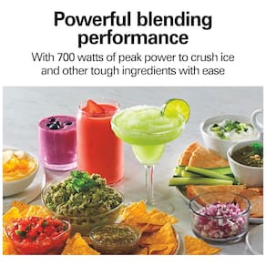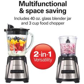 Liquidificador e picador em 1 aparelho Jarro de vidro sem BPA de 40 onças, 1,1 mL e picador de alimentos para 3 xícaras, 720 mL O revolucionário sistema Wave Action continuamente puxa a mistura para baixo nas lâminas para resultados suaves todas as vezes O bico exclusivo e sem confusão com tampa articulada facilita o despejo 4 botões de mistura com 12 funções de mistura para fazer milkshakes e gelo picado para preparação de alimentos como purê, dispositivo, picar e ralar Potência de pico de 700 watts zenamento do cabo