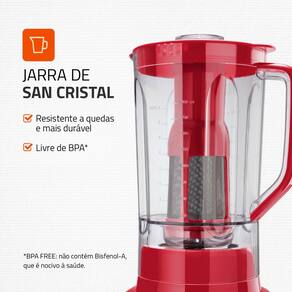 JARRA RESISTENTE: O copo do liquidificador Mondial é feito de San Cristal, material resistente a quedas e riscos, supertransparente e que não pega cheiro ou cor.