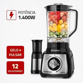 O Liquidificador Mondial Turbo Inox prepara suas receitas com muito mais eficiência. As 6 lâminas de titânio oferecem resistência superior e um poder de corte que transforma até os ingredientes mais duros em misturas homogêneas em poucos segundos. Além disso, a alta potência de 1.400W entrega desempenho constante no preparo de diferentes receitas, enquanto o copo de 3 litros, com encaixe fácil, agiliza o uso e permite preparar porções maiores sem complicação.