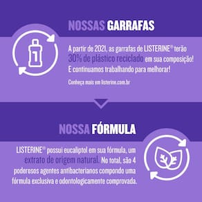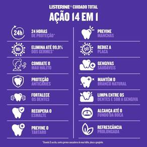 Listerine Cuidado Total além de matar as bactérias e prevenir contra as cáries e a gengivite, fortalece os dentes mantendo o brancos de forma natural. Listerine Cuidado Total garante 24 horas de proteção, deixando você completamente protegido e com um hálito super refrescante.