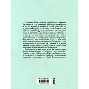 Literatura e Minorias: diálogos II, apresenta importante discussão acerca da literatura e sua relação estabelecida com os chamados grupos subalternos ou minorias, analisando de maneira crítica a relevância desses grupos na literatura e como são recebidas as obras escritas por autores de periferia. A obra se divide em duas partes, onde a primeira apresenta análises sobre os diferentes sujeitos sociais e a segunda traz reflexão sobre as obras literárias realizadas pelas minorias, considerando os negros, autores LGBT, mulheres, onde destacam as dificuldades enfrentadas na sociedade.
