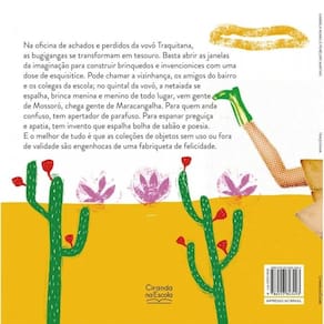 Na oficina de achados e perdidos da vovó Traquitana, as bugigangas se transformam em tesouro. Basta abrir as janelas da imaginação para construir brinquedos e invencionices com uma dose de esquisitice. Pode chamar a vizinhança, os amigos do bairro e os colegas da escola no quintal da vovó, a netaiada se espalha, brinca menina e menino de todo lugar, vem gente de Mossoró, chega gente de Maracangalha. Para quem anda confuso, tem apertador de parafuso. Para espanar preguiça e apatia, tem invento que espalha bolha de sabão e poesia. E o melhor de tudo é que as coleções de objetos sem uso ou fora de validade são engenhocas de uma fabriqueta de felicidade.
