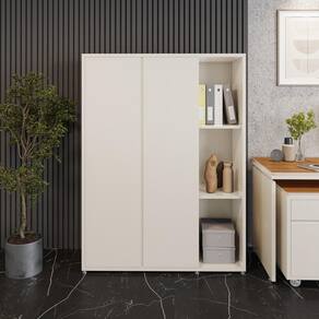 Desenvolvida em MDP e MDF, possui duas portas com puxadores embutidos em MDF laqueado, o que proporciona um toque de praticidade, além de três nichos externos e duas amplas prateleiras internas para armazenar sua biblioteca pessoal, objetos de decoração ou materiais de escritório. O livreiro traz versatilidade e funcionalidade à sua decoração, proporcionando uma organização eficaz para o seu escritório.