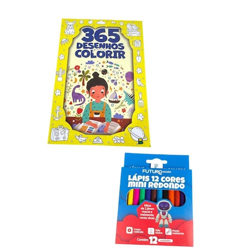 Contém : 1 unidade Livro Infantil 365 Desenhos para colorir + 12 unidades de mini lápis de cor Qual é a medida de cada lápis Cada lápis possui 9 cm de comprimento, um tamanho ideal para as mãos pequenas das crianças, facilitando o manuseio.
