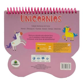 Design atraente: o livro apresenta um formato espiral, ideal para facilitar a visualização das ilustrações de unicórnios, e possui acabamento com laminação fosca, faca especial e hot stamping.