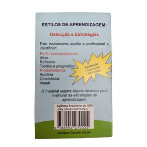 Baralho Estilos De Aprendizagem Caixa com 58 cartas formas de baralho Detecção e Estratégias Este instrumento auxilia o profissional a identificar: Perfil Representacional: Ativo Reflexivo Teórico e Pragmático Predominância: Auditiva Cinestésica. Visual O material sugere alguns recursos para melhorar as estratégias de aprendizagem. Material em papel Marca: Casa Do Psicopedagogo