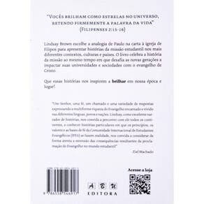 Livro brilhar como estrelas lindsay brown abu editora Lindsay brown escolhe a analogia de paulo na carta a igreja de filipos para apresentar histórias da missão estudantil nos mais diferentes contextos, culturas e países. Olivro celebra a história da missão ao mesmo tempo em que desafia as novas gerações a impactar suas universidades e sociedades com o evangelho de cristo.