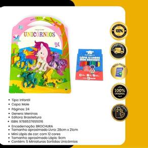 Contém : 1 unidade livro infantil de colorir unicórnios mais cor e diversão com 5 mini unicórnios + 12 mini lápis de cor