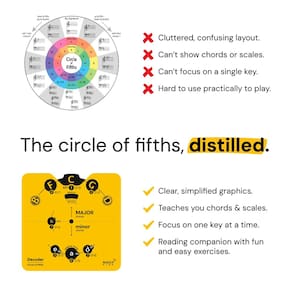 Circle of Fifths For Guitar - Livro de Teoria da Guitarra e Roda de Acordes - Teoria da Música Fácil! Tocar mais, Escrever Mais, Explorar Música (Teoria da Guitarra) - Brilho de canção desbloqueado: explore a seleção e progressão de acordes sem esforço com nossa ferramenta de teoria plástica e livro — seu guia para o brilho da composição, adequado para músicos de todos os níveis. - Fineza visual para impacto: Chame a atenção com um círculo visualmente deslumbrante de design de quintas rodas que simplifica as teclas, acordes, notas, maiores, menores e elementos diminuídos. Ideal para estudantes e professores, eliminando confusão em sua jornada musical. - Resista ao desafio: eleve suas habilidades com uma ferramenta de plástico indestrutível para uma experiência de aprendizado duradoura. Feito de plástico de alta qualidade, este Decoder Circle of Fifths Wheel Pro Edition oferece acesso à teoria musical pronto para shows, à prova de crianças, à prova de respingos! Além disso, tem um suporte de origami patenteado que sai quando você precisa! - Aliado musical em movimento: inclua nossa ferramenta compacta Circle of Fifths com suporte de origami em sua bolsa de show para inspiração instantânea de acordes e orientação de progressão durante sessões de jam espontâneas. Eleve seu desempenho sem esforço, adicionando um toque de requinte musical a cada reunião improvisada.