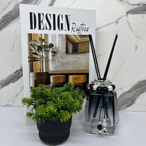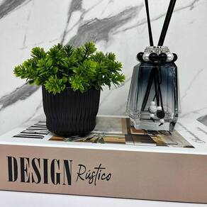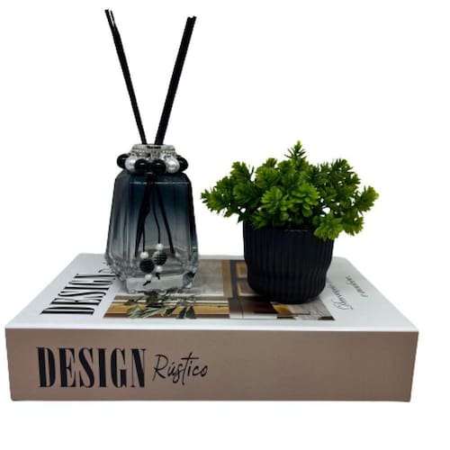 Nada mais encantador, original e inspirador do que utilizar livros na decoração de diversos ambientes, como salas de estar, escritórios, quartos, home office e onde mais sua imaginação permitir. Os livros decorativos são a mais nova tendência na decoração contemporânea e permitem diversas combinações e utilizações, dando um ar de sofisticação em mesas de centro, aparadores, prateleiras, escrivaninhas etc. Esse lindo livro estampa 'Design Rústico', irá encantar você pela riqueza de detalhes e qualidade no acabamento, junto do vaso preto de cerâmica trabalhado e difusor de vidro fumê com detalhe pedras que dão um toque todo especial no ambiente.