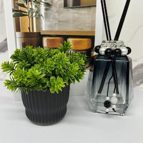 Livro de papelão decorativo estampa 'Design Rústico', vaso preto de cerâmica trabalhado e difusor de vidro fumê com detalhe pedras e pingente.