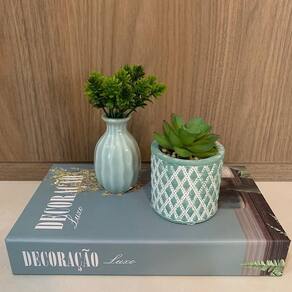 Livro de papelão decorativo estampa 'Decoração Luxo', vaso estampa geométrica e vaso de cerâmica trabalhado.