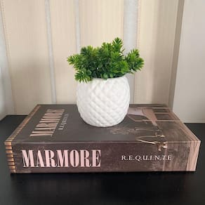 Livro de papelão decorativo estampa 'Marmore Requinte' e vaso branco de cerâmica com trabalhado.