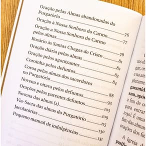 As orações presentes neste devocionário são: Ofício das Almas, Via Sagra, Ladainha, Súplicas e Clamores, Salmos, Novenas, Terços, Orações ao Santíssimo Sacramento em favor das almas e muito mais.