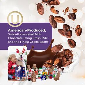 - Folhas de Natal: cada surpresa de Natal com chocolate ao leite é embrulhada individualmente em películas italianas brilhantes e festivas com tema natalino, mantendo os chocolates frescos e tentadores com sua variedade de Papai Noel, bonecos de neve, soldados e caixas de presentes.