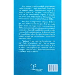 Sinopse Esta obra de John Charles Ryle, popularmente conhecido como J.C. Ryle, nos conduz a uma reflexão profunda sobre a importância da oração e da leitura da Palavra de Deus para a vida dos cristãos. Ryle, em seu conhecimento e repleto de eloquência, ensina com profundidade e abrangência cada um destes dois temas: oração e leitura da Bíblia. Este livro se enquadra na categoria de livros que todo cristão deveria ler, pois Ryle tem muito apreço e zelo em pregar conforme as doutrinas da Bíblia, e ensina muito além de que devemos praticar oração a Deus e leitura bíblica, mas ele explica e expõe, de forma didática e de fácil compreensão, do porque essas coisas são tão importantes para os cristãos, atitude que nos incentiva a buscar ainda mais essas coisas. Você ora? O que você está fazendo com a Bíblia? Você a lê? Como você a lê? Estas são perguntas frequentes feitas pelo autor no decorrer do livro ao leitor, e são perguntas que conduzem a sua escrita para sanar dúvidas, e promover conhecimento e reflexões para os leitores.