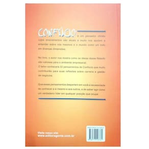 Este livro traz 32 pensamentos de Confúcio que contribuirão para reflexões sobre carreira e gestão de negócios. Incentiva o entendimento de vários aspectos, entre eles a necessidade de conhecer a si mesmo e aos outros e de saber agir como um verdadeiro líder em qualquer posição que ocupe.