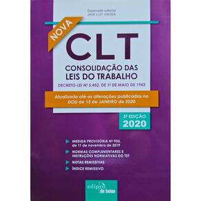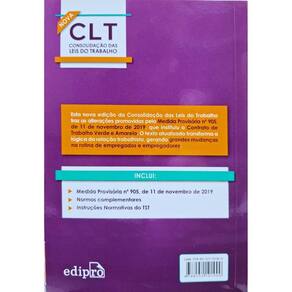 Sinopse Decreto-Lei nº 5.452, de 1º de maio de 1943. Atualizada até a Medida Provisória nº 905, de 11 de novembro de 2019, e o DOU de 13 de janeiro de 2020. Esta nova edição da Consolidação das Leis do Trabalho traz as alterações promovidas pela Medida Provisória nº 905, de 11 de novembro de 2019, que instituiu o Contrato de Trabalho Verde e Amarelo. O texto atualizado transforma a lógica da relação trabalhista, gerando grandes mudanças na rotina de empregados e empregadores. Inclui: