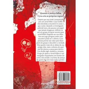 Quando a justiça falha, Cyra cria as próprias regrasDepois que sua irmã é assassinada por um serial killer, Cyra Griffin está decidida a encontrá-lo custe o que custar. Quando a investigação policial trava, ela assume um papel que jamais imaginou: infiltrar-seem um grupo de apoio secreto para serial killers fingindo ser um deles. Em um jogo perigoso onde cada encontro pode ser o último, Cyra precisa provar seu valor para fazer parte do grupo e descobrir a verdade. Mas quanto mais ela se afasta da sua antiga vida, mais o abismo do qual não há retorno a puxa para dentro. Um thriller ágil, sombrio e viciante, Grupo de Apoio a Serial Killers é um mergulho inquietante nos limites do certo e do errado e na fome de justiça de quem não tem mais nada a perder.