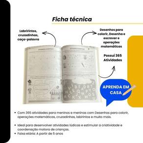 Contém: 1 unidade Livro Infantil 365 Atividades Educativas Aprenda em Casa Esta obra contém atividades de coordenação motora, letras, palavras, escrita, opostos, formas, números, operações matemáticas, desenhos para colorir, caça-palavras, Cruzadinhas, labirintos, ligação de ponto e muito mais Complete o aprendizado da criança, de forma lúdica, flexível e progressiva. Habilidades desenvolvidas: - Estímulo visual; - Concentração; - Coordenação motora; - Criatividade e Imaginação; - Reduz e ansiedade. Autor: Todolivro Páginas: 288 Dimensões: 15,5 x 22 cm Formato: Brochura Faixa etária: 5 anos. Marca: BrasiLeitura Faixa etária: A partir de 5 anos ISBN: 9786556173078 Editora: BrasiLeitura Dimensões: 15.50 x 22.00 cm Idioma: Português Diversão Garantida: Com 365 atividades emocionantes, o livro promete transformar cada dia em uma nova aventura cheia de diversão e aprendizado. Desenvolvimento Criativo: Estimula a criatividade das crianças através de jogos, labirintos e desafios que incentivam a imaginação e o pensamento crítico. Variedade de Jogos: Oferece uma ampla variedade de atividades, garantindo que as crianças nunca fiquem entediadas e sempre tenham algo novo para explorar. Marca: Brasilleitura