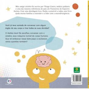 Meu amigo cérebro foi escrito por Thiago Castro, médico pediatra e uma das maiores referências do país em Transtorno do Espectro . Com uma abordagem leve, fluida e acessível a todos, este livroajuda muitas famílias a entender e a lidar com a neurodivergência. Você já teve vontade de conversar com algum órgão do seu corpo e tirar todas as suas dúvidas O Matteo teve Ele escolheu conversar com o cérebro, essa máquina incrível do corpo humano. Que tal embarcar nesse bate-papo e esclarecer várias questões também Editora: Ciranda Cultural Autor: Thiago Castro Ilustrador: Flávio Fargas Idioma: Português Páginas: 32 Dimensões: L 24.00 x A 24.00 x E 0.30 Isbn: 9786526127940 Faixa Etária: + 6 anos Assuntos tags : Psicologia, Saúde, Saúde mental, Emoções, Sentimentos, Neurodiversidade, Infantil, Criança, Presente, Livro presente, Autoajuda, Transtorno do espectro , Ciranda Cultural Bisac: Não Ficção Infantil / Não Ficção Infantil / Saúde e Vida Cotidiana / Saúde Mental Encadernação: Brochura Marca: Não Informado Ean: 9786526127940