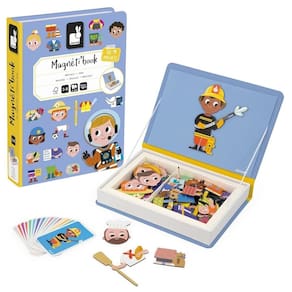 Livro Magnético Profissões 48 peças - janod Com o livro magnético Profissões, a diversão é garantida Com 48 peças magnéticas, as crianças podem criar personagens das mais variadas profissões, seguindo os modelos ou soltando a imaginação. Astronauta, médico, policial e muito mais - todas as combinações são possíveis Como Funciona Ao abrir o livro, as crianças podem colocar os ímãs no lado magnético, que segura tudo no lugar. Perfeito para longas viagens de carro ou momentos de espera Com um design inteligente, o Magneti'book é fácil de transportar e pode ser armazenado como um livro na estante. Feito com materiais certificados FSC e outros materiais controlados, esse brinquedo é seguro e sustentável