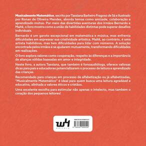 O livro infantil Musicalmente Matemático, escrito por Tassiana Barbeiro Fragoso de Sá e ilustrado por Ronan de Oliveira Mendes, é uma obra encantadora que aborda temas como amizade, colaboração e aprendizado mútuo. Por meio das divertidas aventuras dos irmãos Bernardo e Maitê, o livro mostra como a união de habilidades distintas pode superar desafios individuais. Bernardo é um garoto excepcional em matemática e música, mas enfrenta dificuldades em expressar sua criatividade artística. Maitê, ao contrário, é uma artista habilidosa com dificuldades para lidar com números. A solução encontrada pelos irmãos é se ajudarem mutuamente, transformando dificuldades em realizações. Com ilustrações vibrantes e texto envolvente, o livro explora valores como cooperação, respeito às diferenças e a importância de alianças sólidas baseadas em amor e integridade. Tassiana, que também é fonoaudióloga, oferece ainda valiosas dicas para pais e educadores potencializarem o processo de leitura e aprendizado das crianças.