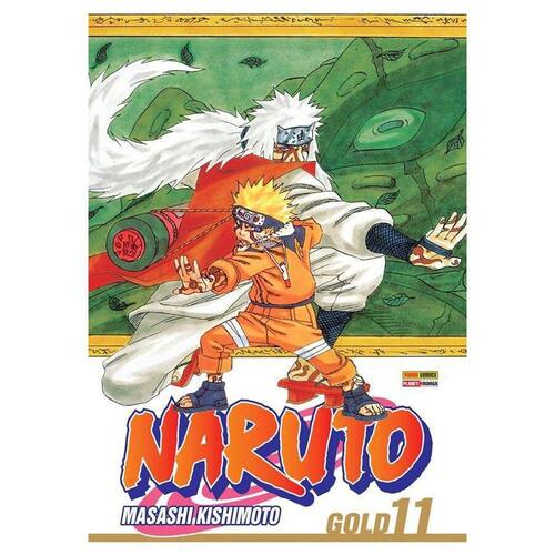 Livro Naruto Gold - Volume 11 Com o fim das preliminares da terceira etapa, os aspirantes a Chunin têm um mês para se recuperar e se preparar para os duelos da etapa final do exame Naruto estava se esforçando ao máximo no treinamento com o professor Ebisu, mas um misterioso eremita e seu sapo os interrompem e nocauteiam o professor
