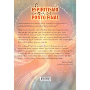 Estivesse Allan Kardec encarnado, o que diria do Espiritismo na atualidade? Diria que progrediu? Que estacionou? Não precisa responder, caro leitor. Esta é apenas uma provocação para que você se prepare para o que vai encontrar neste novo livro de Wilson Garcia. O autor, sobejamente conhecido por seus textos argutos e instigantes, abre um novo parágrafo para sacudir a carruagem de alguns confrades acomodados e fazer valer o estandarte de fé raciocinada da doutrina espírita. Com certeza, O Espiritismo depois do ponto final põe o dedo nas feridas que ainda sangram no seio da doutrina, dividindo laicos e religiosos, progressistas e conservadores. Mas não vem acirrar disputas e confrontos. Longe disso. O objetivo do jornalista e escritor Wilson Garcia não é outro senão fazer pensar, porque está convicto que dessa fervura virá bom caldo e do embate de ideias surgirá a luz. Rubens Toledo (Jornalista e compositor)