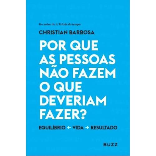 Um dos assuntos mais debatidos dos ultimos tempos diz respeito a qualidade de vida. Mas o que exatamente isso significa Andamos tao estressados com o trabalho e outras pressoes do dia a dia que muitas vezes deixamos de lado nosso bem-estar. E isso tem consequencias em nossa saude e em nossos relacionamentos. Nesse livro, christian barbosa explica que, para viver bem, precisamos administrar nosso tempo de forma a alcancar niveis iguais - e elevados - de equilibrio e resultado. Parece simples. Entao por que nem todas as pessoas conseguem fazer isso Muitas vezes queremos realizar algo que nos parece tao grandioso que achamos quase impossivel e acabamos paralisados, sem dar o primeiro passo. Ha muitos motivos para isso, como falta de tempo ou de energia, medo e autossabotagem. Em porque as pessoas nao fazem o que deveriam fazer, voce descobrira que e possivel superar todos esses obstaculos.