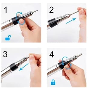 Baixo Calor / Baixo Ruído / Baixa Vibração: a Caneta de liga de alumínio de qualidade é composta de torque poderoso e silencioso com dissipação de calor inteligente e baixa vibração, confortável de segurar na mão, sistema de trava de torção facilita a troca de brocas de unha.