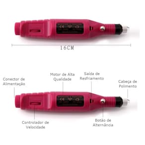 Características: Bivolt Controle de Velocidade, variando de 3.000 a 20.000 RPM Portátil Pode ser usada em unhas naturais Pode ser usada em unhas postiças de Porcelana, Acrílica e Gel