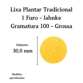 Lixa plantar Jahnke com gramatura 100, indicada para trabalhos de desbaste inicial e regularização de superfícies mais firmes. Modelo com furo central único, compatível com mandris simples de 1 furo.