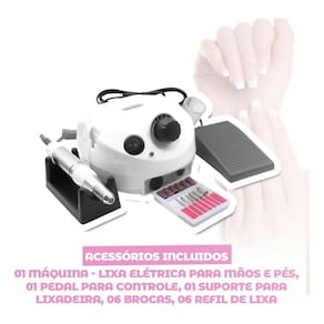 Itens Inclusos: 1 - Motor 1 - Caneta 1 - Pedal 1 - Copinho 1 - Suporte 1 - Conjunto Lixa e brocas 6 lixas e 6 brocas Marca: Lixar Unhas Profissional Ean: 7905246284975