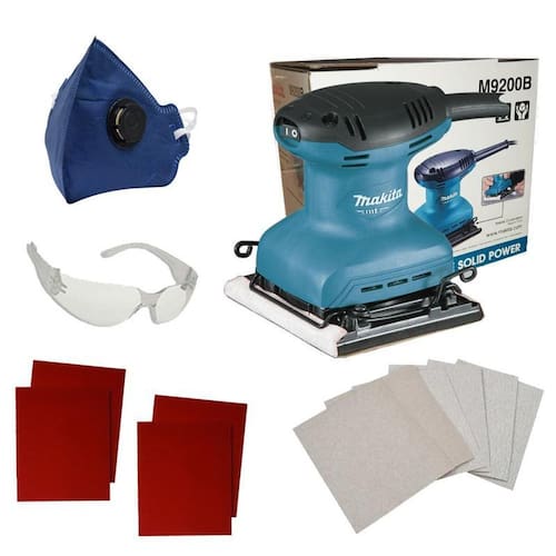 Lixadeira orbital makita m9200b 14000 opm 180w + mascara Voltagem: 220v Lixadeira orbital de madeira modelo m9200b da makita com 180w de potência + lixas, óculos e máscara