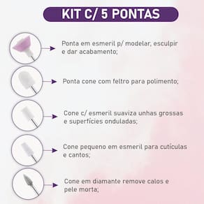 Deixe suas unhas lindas com esse kit de tratamento de unhas profissional, alcance resultados perfeitos em minutos com o aparelho rotatórios e suas 5 pontas intercambiáveis. Recomendado para qualquer tipo de unhas, sejam postiças, típicas como de gel, naturais ou de porcelana. Proporciona um surpreendente acabamento de ótima qualidade.