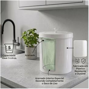 Na Lixeira com Tampa nenhuma parte do saquinho de lixo fica aparente, graças ao aramado interno que prende e esconde o saquinho ou a sacola de lixo, e é muito fácil de trocá-los para fazer o descarte do lixo. A lixeira possui um tamanho perfeito para ser usada no escritório, no banheiro ou até mesmo na cozinha.