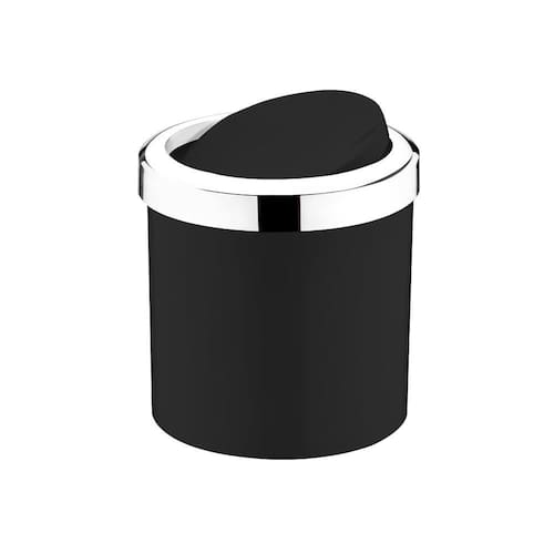Lixeira 5L com Tampa Basculante Preta com Cromado Future. Na Lixeira com tampa basculante nenhuma parte do saquinho de lixo fica aprente, graças ao aramado interno que prende e esconde o saquinho ou a sacola de mercado. E é muito fácil de trocá-los para fazer o descarte do lixo. Fabricada em plástico, é indicada para uso em banheiros ou cozinhas. Medidas: Profundidade: 20cm / Largura: 20cm / Altura: 21cm.