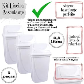 Conjunto com 3 lixeiras. A lixeira com tampa basculante é a solução ideal para manter seus ambientes limpos e organizados com praticidade e estilo. Com capacidade para 14 litros, esta lixeira é perfeita para uso doméstico ou em ambientes comerciais, como escritórios, cozinhas, banheiros e áreas de serviço. Fabricada em plástico de alta qualidade, a lixeira é durável e resistente, garantindo um uso prolongado e eficiente. A tampa basculante tipo vai e vem oferece conveniência e higiene, permitindo que você descarte o lixo de maneira rápida e fácil, sem a necessidade de tocar diretamente na tampa. Este mecanismo mantém os odores controlados e impede a visualização do conteúdo interno, contribuindo para um ambiente mais limpo e agradável. Além disso, a lixeira conta com proteção contra raios UV, o que assegura que a cor e a qualidade do material permaneçam intactas mesmo quando exposta à luz solar. Essa característica torna a lixeira ideal tanto para ambientes internos quanto externos, garantindo sua durabilidade e estética ao longo do tempo. Com um design moderno e compacto, a lixeira se adapta perfeitamente a qualquer decoração, ocupando pouco espaço e oferecendo grande capacidade de armazenamento de resíduos. A lixeira de 14 litros é ideal para atender às necessidades diárias de descarte de lixo, seja em casa ou no trabalho. A Lixeira é fácil de limpar, permitindo que você mantenha a higiene e a aparência do produto com pouco esforço. Seu material resistente é projetado para suportar o uso diário, garantindo que a lixeira permaneça funcional e esteticamente agradável por muito tempo. Material: polipropilenoCapacidade: 14 litrosComprimento: 27 cm / Largura: 22 cm / Altura: 47 cm