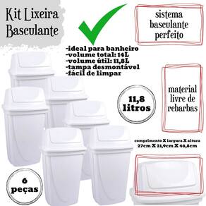 Conjunto com 6 lixeiras. A lixeira com tampa basculante é a solução ideal para manter seus ambientes limpos e organizados com praticidade e estilo. Com capacidade para 14 litros, esta lixeira é perfeita para uso doméstico ou em ambientes comerciais, como escritórios, cozinhas, banheiros e áreas de serviço. Fabricada em plástico de alta qualidade, a lixeira é durável e resistente, garantindo um uso prolongado e eficiente. A tampa basculante tipo vai e vem oferece conveniência e higiene, permitindo que você descarte o lixo de maneira rápida e fácil, sem a necessidade de tocar diretamente na tampa. Este mecanismo mantém os odores controlados e impede a visualização do conteúdo interno, contribuindo para um ambiente mais limpo e agradável. Além disso, a lixeira conta com proteção contra raios UV, o que assegura que a cor e a qualidade do material permaneçam intactas mesmo quando exposta à luz solar. Essa característica torna a lixeira ideal tanto para ambientes internos quanto externos, garantindo sua durabilidade e estética ao longo do tempo. Com um design moderno e compacto, a lixeira se adapta perfeitamente a qualquer decoração, ocupando pouco espaço e oferecendo grande capacidade de armazenamento de resíduos. A lixeira de 14 litros é ideal para atender às necessidades diárias de descarte de lixo, seja em casa ou no trabalho. A Lixeira é fácil de limpar, permitindo que você mantenha a higiene e a aparência do produto com pouco esforço. Seu material resistente é projetado para suportar o uso diário, garantindo que a lixeira permaneça funcional e esteticamente agradável por muito tempo. Material: polipropilenoCapacidade: 14 litrosComprimento: 27 cm / Largura: 22 cm / Altura: 47 cm