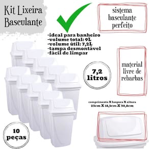 Conjunto com 10 lixeiras. A lixeira com tampa basculante é a solução ideal para manter seus ambientes limpos e organizados com praticidade e estilo. Com capacidade para 7,2 litros, esta lixeira é perfeita para uso doméstico ou em ambientes comerciais, como escritórios, cozinhas, banheiros e áreas de serviço. Fabricada em plástico de alta qualidade, a lixeira é durável e resistente, garantindo um uso prolongado e eficiente. A tampa basculante tipo vai e vem oferece conveniência e higiene, permitindo que você descarte o lixo de maneira rápida e fácil, sem a necessidade de tocar diretamente na tampa. Este mecanismo mantém os odores controlados e impede a visualização do conteúdo interno, contribuindo para um ambiente mais limpo e agradável. Além disso, a lixeira conta com proteção contra raios UV, o que assegura que a cor e a qualidade do material permaneçam intactas mesmo quando exposta à luz solar. Essa característica torna a lixeira ideal tanto para ambientes internos quanto externos, garantindo sua durabilidade e estética ao longo do tempo. Com um design moderno e compacto, a lixeira se adapta perfeitamente a qualquer decoração, ocupando pouco espaço e oferecendo grande capacidade de armazenamento de resíduos. A lixeira de 7,2 litros é ideal para atender às necessidades diárias de descarte de lixo, seja em casa ou no trabalho. A Lixeira é fácil de limpar, permitindo que você mantenha a higiene e a aparência do produto com pouco esforço. Seu material resistente é projetado para suportar o uso diário, garantindo que a lixeira permaneça funcional e esteticamente agradável por muito tempo. Material: polipropilenoCapacidade: 7,2 litrosComprimento: 23 cm / Largura: 18 cm / Altura: 40 cm