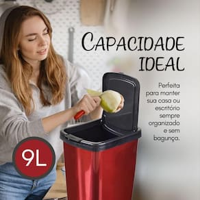 Mantenha seus espaços sempre limpos e organizados com praticidade e sofisticação. A Lixeira Cesto 9 Litros Click Label é a escolha perfeita para quem aprecia funcionalidade sem abrir mão do design.Lixeira Cesto 9 Litros com Tampa Click Label Vermelha Metalizada