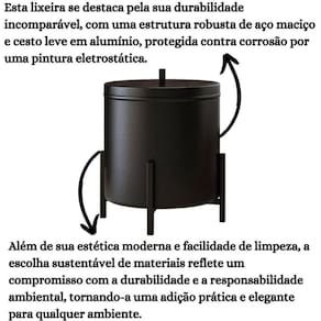 Durabilidade Garantida: A base de aço maciço e o cesto em alumínio conferem robustez e resistência, garantindo uma peça duradoura.