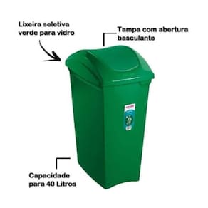 Lixeira cesto plástico seletiva verde 40 l basculante sr64/24 sanremo Lixeira seletiva verde plastico 40l sanremox005fx000d x005fx000d Lixeira com design elegante que otimiza espaço e inteligente: verde - padrão universal de cor que identifica resíduos de vidro. Possui pegas inferiores e superiores para encaixe das mãos, permitindo sempre o melhor esvaziamento. E mais: angulação da tampa basculante, que garante bom volume da caixa interno e faz bonito em qualquer ambiente.x005fx000d x005fx000d 40 litros.x005fx000d Esvaziamento fácil.x005fx000d Verde: padrão universal de cor que identifica resíduos de vidrox005fx000d Pegas inferiores e superiores: fácil de manusear no dia a dia.x005fx000d x005fx000d x005fx000d x005fx000d Volume da caixa 17458,893x005fx000d Medidas 406 x 291 x 614 mmx005fx000d Código de barras 7896359025022x005fx000d Quantidade da caixa 6x005fx000d Caixa mista nãox005fx000d Material plástico Marca: Não Informado Ean: 7896359025053