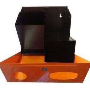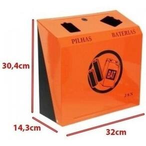 Coletor de parede para descarte de pilhas e bateriasMateriais utilizados:Aço carbono 1020 e pintura epóxiDescrição:Suporte de parede para descarte de pilhas e baterias em aço carbono 1020 com pintura eletrostática nas cores preta e laranja.Possui dois recipientes internos com capacidade de 3,85l (cada) para separação do resíduo a ser coletado confeccionados em aço carbono 1020 e pintura eletrostática preta.Acompanha adesivo correspondente e kit contendo buchas, parafusos e chave plástica.Medidas: 320 mm (largura) x 304 mm (altura) x 143 mm (profundidade).