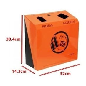 Coletor de parede para descarte de pilhas e bateriasMateriais utilizados:Aço carbono 1020 e pintura epóxiDescrição:Suporte de parede para descarte de pilhas e baterias em aço carbono 1020 com pintura eletrostática nas cores preta e laranja.Possui dois recipientes internos com capacidade de 3,85l cada para separação do resíduo a ser coletado confeccionados em aço carbono 1020 e pintura eletrostática preta.Acompanha adesivo correspondente e kit contendo buchas, parafusos e chave plástica.Medidas: 320 mm largura x 304 mm altura x 143 mm profundidade .