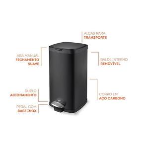 Lixeira Com Pedal E Balde Frame 20L Preto Brinox Descrição: A Lixeira com pedal, corpo de aço carbono e balde removível da linha Frame, serve tanto para combinar com ambientes modernos quanto para descontrair os mais tradicionais, dando um toque de requinte e sobriedade ao cômodo. Bonita e versátil, ela possui duplo acionamento, aba manual, pedal com base de inox e, pode ir da cozinha ao escritório. A tampa de inox com alça e fechamento suave traz mais facilidade e praticidade ao utilizar e transportar o produto. Contém: 1 Lixeira 20LImportante: Material: Aço CarbonoCor predominante: PretoCapacidade: 20LDimensões: 35,5 x 27 x 47,7cm