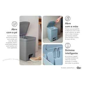 Com design contemporâneo, moderno e minimalista, as Lixeiras de Pedal Trium foram desenvolvidas para solucionar problemas do cotidiano com mais praticidade e sustentabilidade. Sua capacidade de 12 Litros é ideal para diversos ambientes da casa ou escritório. Além disso, possui tampa especial que não deixa o saquinho de lixo exposto na parte externa da lixeira, e anel de fixação que proporciona mais segurança ao colocar o saco para lixo, trazendo mais sofisticação ao evitar que o saco fico aparente.