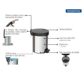 Que tal uma lixeira diferente para a sua casa? Com mix de materiais e garantia de qualidade e resistência, a Lixeira de pedal New 5L da Tramontina é fabricada com corpo em Aço Inox e tampa plástica. Com capacidade de 5L ela não necessita de balde plástico, podendo utilizar somente o saco de lixo de 10 - 15 L que fica preso pelo orifício lateral da lixeira. Ao fechar a tampa, o saco de lixo não aparece, mantendo a estética do produto. A lixeira é durável, resistindo a mais de 1 milhão de ciclos (abertura e fechamento). Outro diferencial é que a tampa não bate na parede quando aberta.